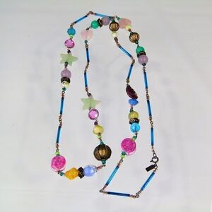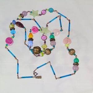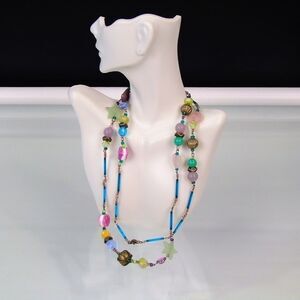 One of a Kind 1980's Iris Lane Long Necklace . Green ~ Pink ~ Blue . Mixed Materials Of Semi Precious Stones & Glass . Measures App. 40" No Flaws to Note .
