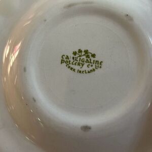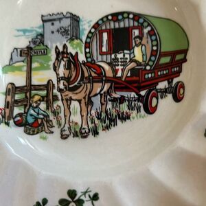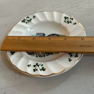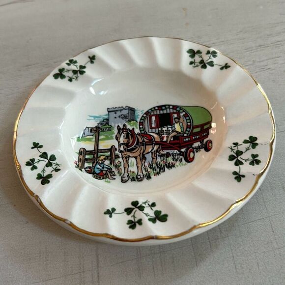 Vintage ashtray. Made in Ireland in Cork Ireland. Features gold ram with clovers and a castle scene on front. Approximately 5 inches round.