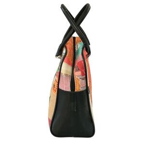 Beautiful vintage Isabella Fiore. “Walking Stanley”. Rhinestone embellishments on brushed canvas. Handles, sides and bottom are black leather. Tiny spot as shown near flowers. Corners have mild scuffing as shown. Satchel, top handle bag. 9.5” X 11” X 4” excellent preowned condition.