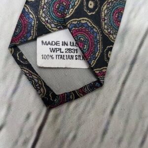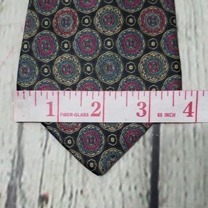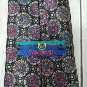 Pre-owned Men's vintage Woodward 100% Italian silk neck tie. Made in USA. It is black with blue and red colored medallions printed on it. Width measurements are in photos. Total length is 56.5"