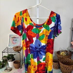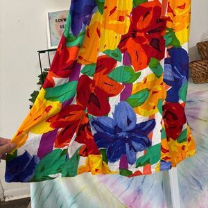 Bright floral dress with a colorful pattern. Features red, blue, yellow, and green flowers.