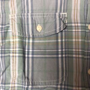 Early 2000’s Vintage J. Crew. Relaxed spring/summer button-down. I love it open with a bathing suit. In great shape but there’s a misshaped button on the left sleeve. Please see pics.