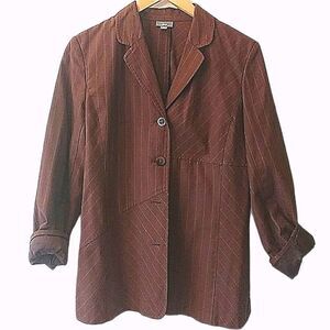 Three-season cotton/linen blend blazer featuring unique, asymmetrical seaming front and back make this jacket not your typical blazer. Lined sleeves. Tobacco brown with subtle pinstripes.