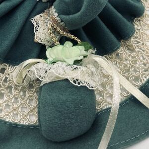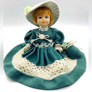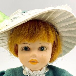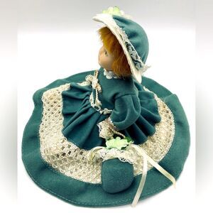Charming vintage JM 05 doll wearing a velvet dress adorned with lace. Features a matching hat with floral accents.Approximately measurement:8”Pre-owned excellent condition