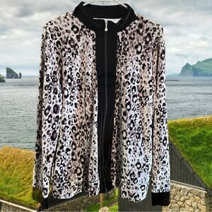 A81- This beautiful Valore jacket has an animal print with the touch of sophistication with the solid black collar, solid black middle section with the zipper and the solid black cuffs. Also has two pockets. Measures 23 inches pit to pit. Measures 25 inches from shoulder to bottom.