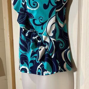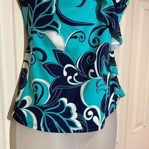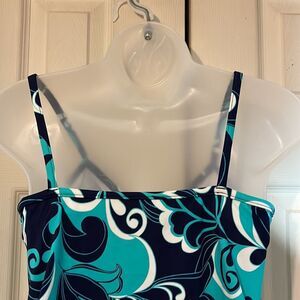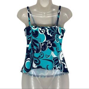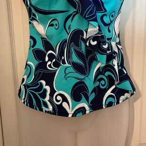 Navy blue, white, and turquoise green tankini top in a large paisley print