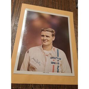Original vintage James Hylton NASCAR promotional photo from the late 1960s to early 1970s. Printed on medium-weight cardstock, measures approximately 8.5" x 11". Features Hylton in a white Goodyear and Union 76 branded racing suit with patriotic red and blue accents. There is water staining visible on the back of the photo, but it has not affected the front image. Light wear from age. Still displays well and remains a solid collectible piece of early NASCAR history.