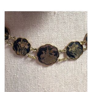 Vintage Japanese Damascene Necklace Graduated Scenic Panels Floral Pagoda 15.5"