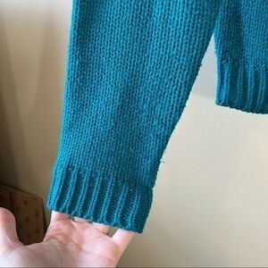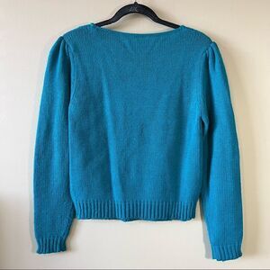 Vintage Jeana women’s teal sweater. Sleeves puff out a bit at the shoulders.