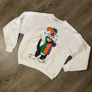 Vintage 1990s white crewneck pullover sweatshirt featuring a front graphic of Sylvester from Looney Tunes.