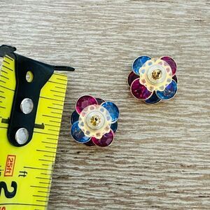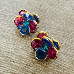 Beautiful vintage crystal jeweled stud earrings with blue and pink color tones and center teal blue stone. Gold tone trim. Excellent like new condition. Unsure of age.