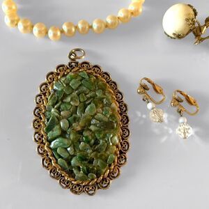 Includes glass pearl necklace, large gold tone filigree jade chip necklace pendant, chain link bracelet with decorative beads and three pairs of earrings, two pairs are clip on and the large stone bead pair are screw backs which may need cleaning.