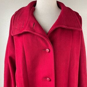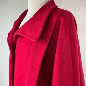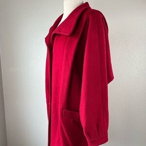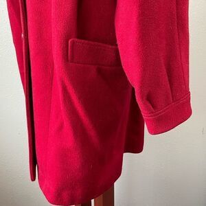 Super fun red wool vintage overcoat in excellent preowned condition. It measures 25 inches armpit to armpit laying flat and 36 inches in length from shoulder to hem.