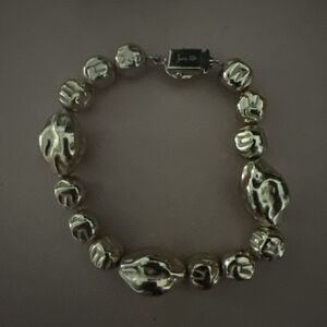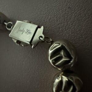 This Vintage Judy Lee Signed Gold Tone Beaded Bracelet features a unique linked chain design with beautiful Lucite bead charms. The 7 inch bracelet is crafted in the United States and showcases the signature style of the renowned brand Judy Lee. The gold tone metal adds a touch of elegance to this statement piece perfect for any fashion jewelry collection.