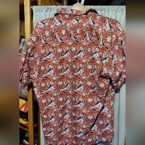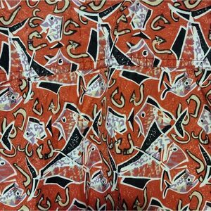 red, fish and hook pattern, vintage Hawaiian shirt. there is writing on the tag, see pictures. cotton with shell buttons