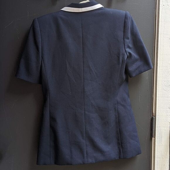 A throwback navy and white blazer worthy of Princess Diana in her prime. Padded shoulders, flattering wrap neckline with white contrast piping draws attention to the neckline. Double breasted front closure adorned with elegant crown signet buttons. Short sleeves. Hits at mid-hip.