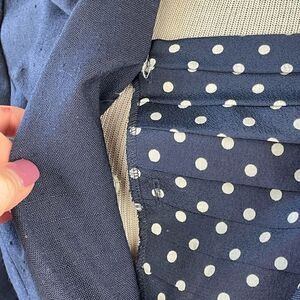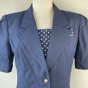 Vintage Kasper Womens Navy Blue Suit Jacket Size 10. This beautiful jacket features a built in polka dot top. It measures 18 inches armpit to armpit and 25 inches in length.