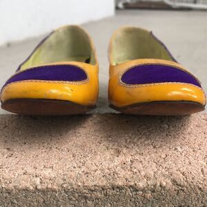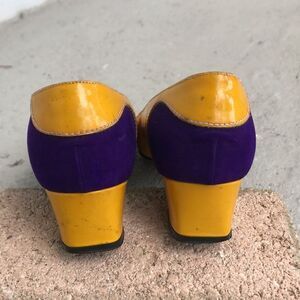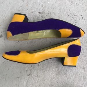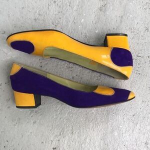 For Saks fifth Avenue. Is our fantastic 1960s mod shoes. Please look at the pictures they have a couple of light marks, barely visible and due to their age. The gold patent leather has fading also barely visible. Kitten heel 1.5 inches. Both insoles need to be glued down at the back of the heel.