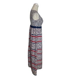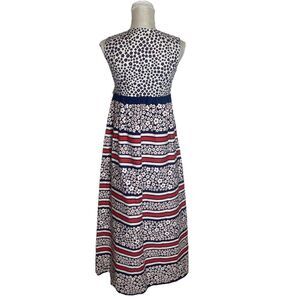 Vintage Keyloun Flower Power Maxi Dress, from the late 1960’s, early 1970’s. Rare and hard to find. Stunning vintage statement all cotton maxi dress featuring a floral on floral print in shades of red, white & blue. Perfect summer styling with A-line shape & the sweetest little white globe buttons from top to bottom. Fabric is a nice, crisp woven medium weight textured cotton that has no stretch. See measurements in pictures for exact fit. Best fits size small. Estimated as a modern size 2/4.
