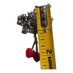 Vintage Keystone Floral Brooch Dangling Red Heart Charm Silver Tone Souvenir Pin