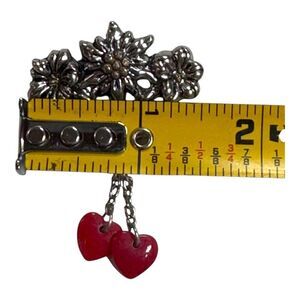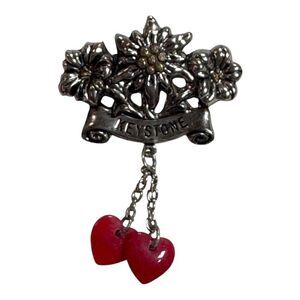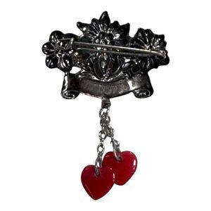 This Keystone brooch offers a timeless design featuring floral accents and red heart charms. Its silver-tone finish complements various outfits, blending elegance with subtle charm.