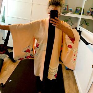 Perfect, lined vintage Kimono. No tags. Absolutely stunning. Wear it as a robe or over a dress, shorts, or pants, or even a swimsuit for a boho look. Wear it to your next festival! I would say this is a medium size. See above for measurements. I wear a med for reference.