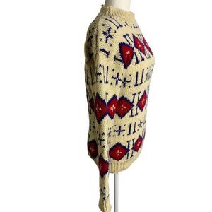 Vintage 80s Knit Wool Mock Neck Sweater S Beige Long Sleeves Pullover Diamonds
