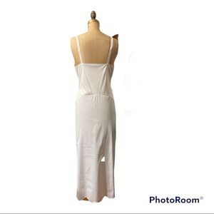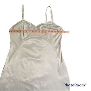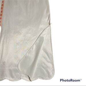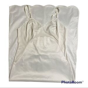 Komar nylon night dress or underslip in ivory cream has darted bust, adjustable straps, scalloped hem and bust and a slit up the left side. Made in the USA.