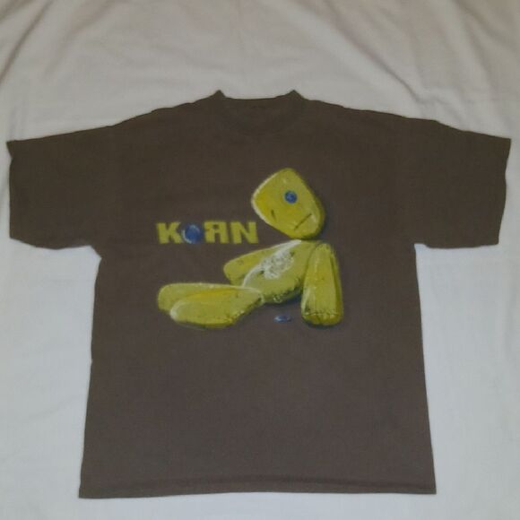 Brown t-shirt featuring a Korn graphic with a yellow figure.
