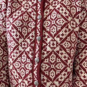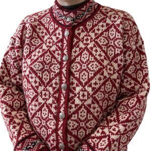 Vintage LL Bean Womens Red White Nordic Wool Snowflake Cardigan Sz L Made USA