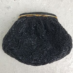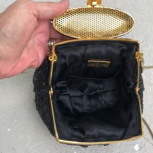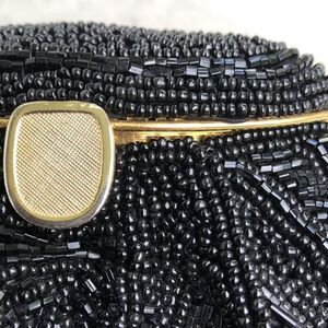 Super sweet mini beaded bag around the closure you could maybe tighten the stitch down but not necessary. Chain has discoloration. Measuring across the bottom is approximately 7 x 5 x 3 chain drop is 20. Inside is clean.