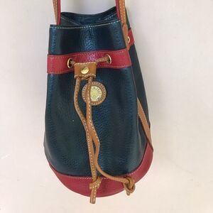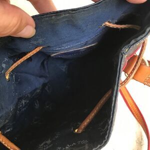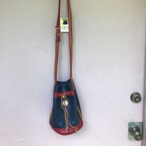 This small drawstring bag has never been used. It is small in size measuring 9 inches in height 6 inches across the bottom. Has one little spot that I post that just comes from being put away. Color is navy, red and natural tan