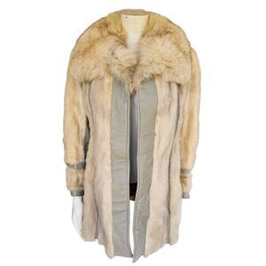 Stunning vintage Lazarus genuine fur and gray leather coat, likely from the 1970s. This elegant piece showcases soft natural beige/tan fur panels paired with gray leather trim, a dramatic oversized fur collar, and a patterned satin lining. Detailed with snap accents at the cuffs, this coat is a true statement piece — perfect for collectors or anyone looking for a timeless vintage look.