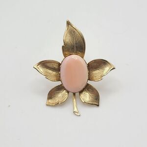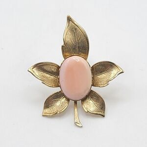 Elegant vintage gold toned leaf brooch featuring a soft pink stone. Perfect for adding a touch of sophistication to any outfit.