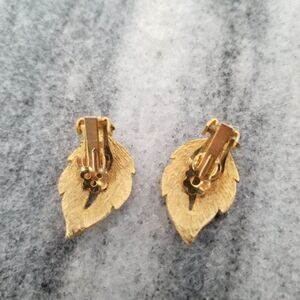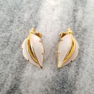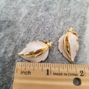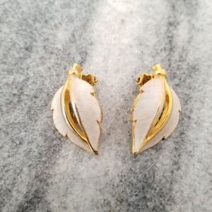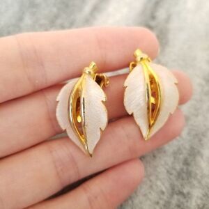 Vintage Leaf Shaped Clip On Earrings, White and Gold Tone, Retro Design, Estate