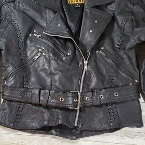Black leather cropped Laced, studded, Braided, woven Biker moto Jacket.  Front only belt.