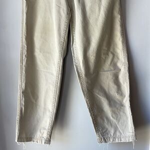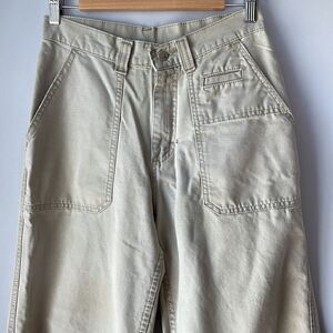 These Vintage Lee Riveted Tan Chino Khaki Pants are high rise and so soft. They are super flattering cut. Raw hem vibes. No size tag but I’m a 4 and wore them on my hips. Check flat mead tho: