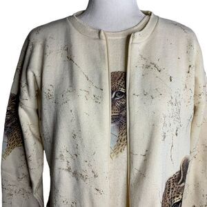 Vintage Leopard Cardigan Silk Top Set M Cream Knit Full Zipper Rhinestone Eyes