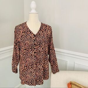 Vintage button up top in size medium. V neck. Leopard print. 100% cotton fabrication. Has small black buttons half way with side vents. Such a dope piece! Looks like purse wear on the right side as depicted (magnified) in last picture. Otherwise no holes or stains. Please see measurements in pictures.