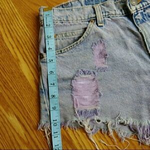 Vintage Levis 550 distressed jean shorts with raw hem. The color is light purple with a little shade of blue. For more accurate sizing looks in the pics, the tag shows 34.
