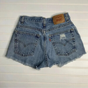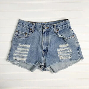 A vintage 90s pair of Levi’s 569 jeans that were professionally altered and distressed into a trendy pair of shorts.