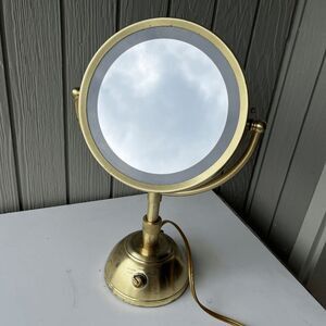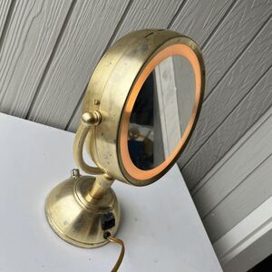 vintage vanity mirror, retro makeup mirror, lighted tabletop mirror, brass tone mirror, magnifying mirror, swivel mirror, mid-century style, adjustable mirror, glam vanity decor, illuminated mirror, Hollywood vanity, makeup station, beauty lighting, vintage bathroom decor, working vintage mirror, Conair mirror, old-school charm, nostalgic beauty, golden patina, retro glam