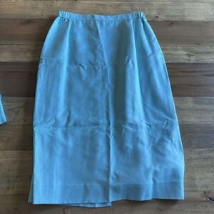 This fits approx a size 8-10, see measurements for accurate sizing. It is a beautiful vintage skirt and jacket set. I believe this was never worn and the skirt still has the original tag on it. The jacket does have a small black dot near the neck that I included a picture of, it is tiny and I did not attempt to remove it