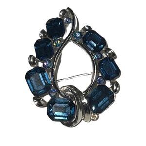 This pin is amazing with gorgeous blue elongated cut glass stones with sparkling aurora borealis rhinestones set in silver tone setting. The brooch is eye catching and will bring comments galore.