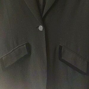 100% wool tuxedo jacket with velvet trim on the collar, pocket flaps, even around the buttonhole. This jacket would be a fun dress alternative for the holidays. Lightly-padded shoulders. Fully lined, single button closure, non-functional flap pockets.