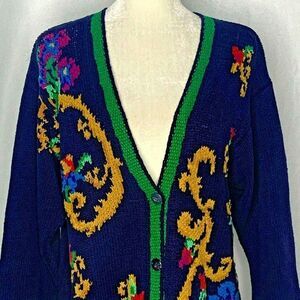 Vintage Liz Claiborne Knit Cardigan Sweater M Blue Floral Silk Blend Buttons