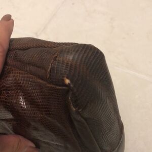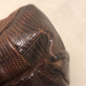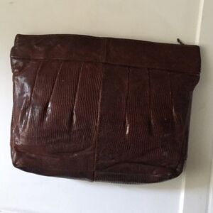 Super soft lizard clutch, 60's? Clean inside . Has attached inside change pocket. Can't see name, A little square of leather has come off. Sold as is. Measuring across the bottom is 9 inches measuring across the top is 11” x 7.5 x 2