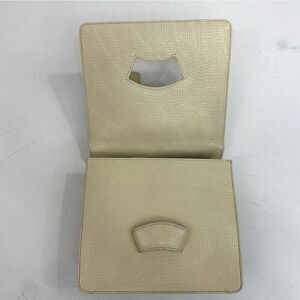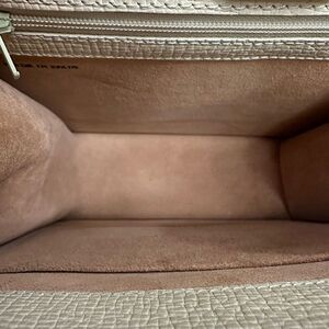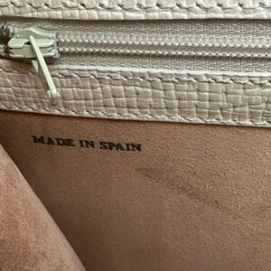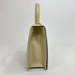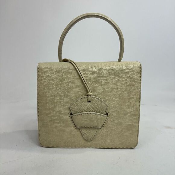Vintage Loewe Barcelona Bag is cream leather, and has the logo embossed on front, a leather top handle and removable clasp closure. There is a very minor discoloration spot on the top corner (refer to pics), but the bag is in otherwise excellent condition. This is a vintage, pre-owned item with basic wear and fade. Please refer to the pictures and size measurements.