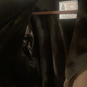 No inner fabric content label but this has a plush faux fur lining. Sleeves are lined in a luxurious satin type material. Outer is a polyester type fabric. Lightly padded shoulders. With 2 deep pockets. Extra button in pocket.