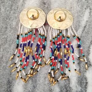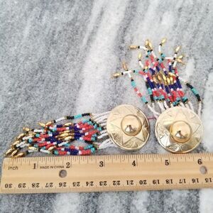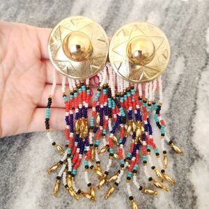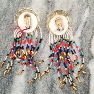 Vintage Long Beaded Colorful Fringe Clip On Earrings, Rainbow, Retro Estate